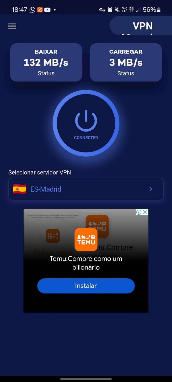 Teste de velocidade: Monitore a velocidade de download e upload diretamente no app.